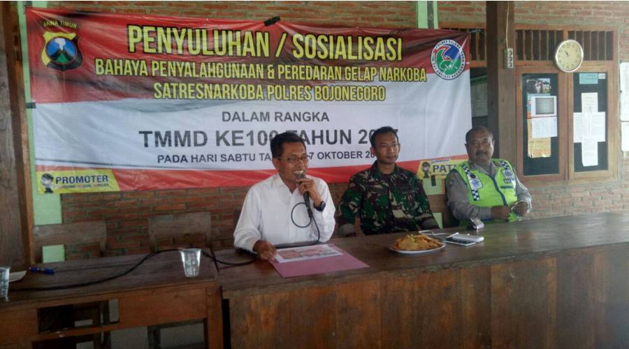Jagatpos.com, Bojonegoro – Guna mendukung kesuksesan pelaksanaan TNI Manunggal Membangun Desa (TMMD) Ke-100 Kodim 0813 Bojonegoro tahun 2017, Polres Bojonegoro melaksanakan penyuluhan Bahaya Narkoba, di Balai Desa Meduri, Kecamatan Margomulyo, Kabupaten Bojonegoro, Jawa Timur, Senin (09/10/2017).
