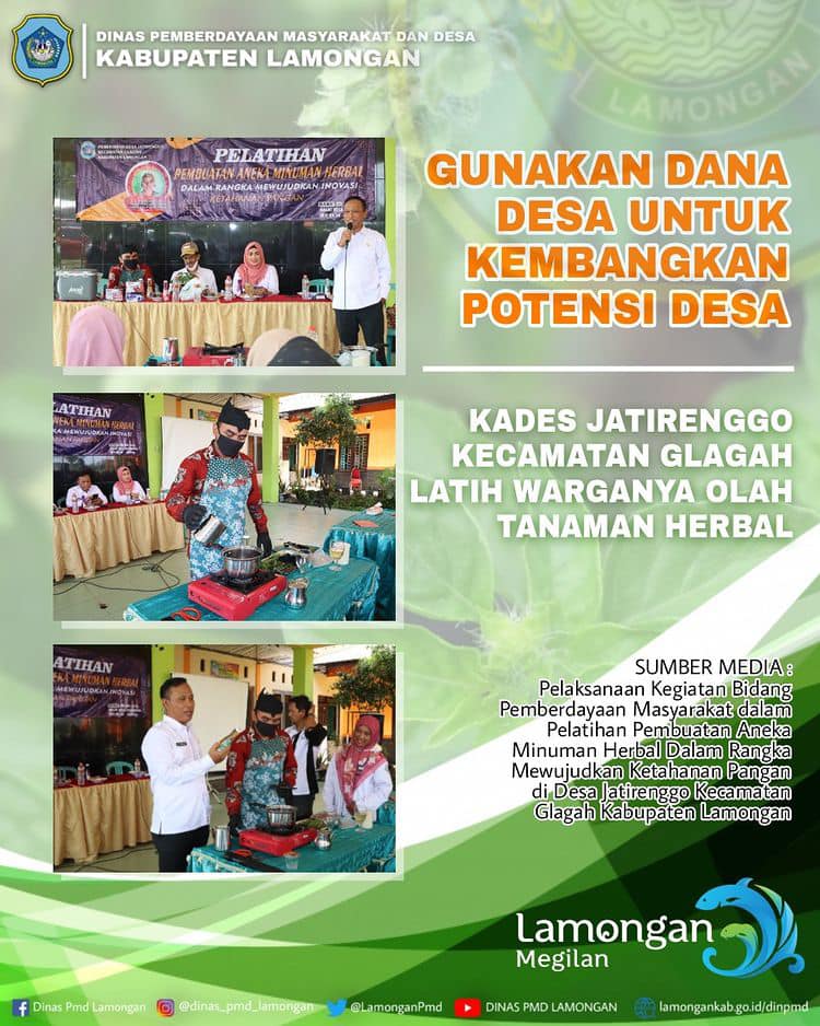 Kegiatan ini mengusung tema “Pelatihan Pembuatan Aneka Minuman Herbal Dalam Rangka Mewujudkan Inovasi Ketahanan Pangan”. Hadir dalam acara tersebut Camat Glagah (Khoirul Muhsinin, S.Pd), Kades Jatirenggo Kecamatan Galagah (Ibu Try Deasy Kusuma Ning Ayu) didampingi oleh Pendamping Desa di Kecamatan Glagah serta Narasumber yang diambil dari pemilik UD. Rumah Kreatif Bojonegoro (Bpk. Adib Nurdiyanto, M.Pd).