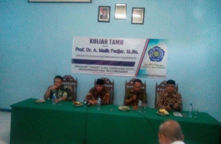 Jagatpos.com, Bojonegoro – Anggota Dewan Pertimbangan Presiden Republik Indonesia (Watimpres RI), Prof. Dr. Abdul Malik Fadjar dalam kunjungan kerjanya di Kabupaten Bojonegoro menyempatkan memberikan kuliah tamu, di Sekolah Tinggi Ilmu Tarbiyah Muhammadiyah (STITM) Bojonegoro, Kamis (03/08/2017).