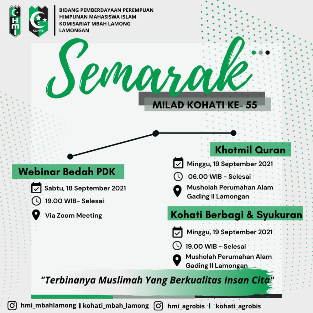 Kegiatan tersebut bertajuk “SEMARAK MILAD KOHATI KE-55 dengan tema Terbinanya Muslimah Yang Berkualitas Insan Cita” ini, diselenggarakan secara online dan offline. Rangkaian kegiatan semarak Milad Kohati tersebut dilakukan selama dua hari, yakni pada tanggal 18-19 September 2021.