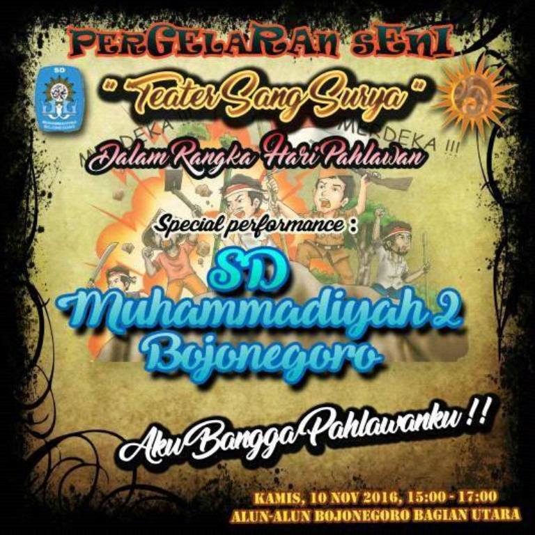 Sedang gelaran teater ini, akan ditampilkan oleh anak – anak pelajar Sekolah Dasar Muhamadiyah 2 Bojonegoro (SD Mudabo) yang tergabung dalam Teater Sang Surya.
