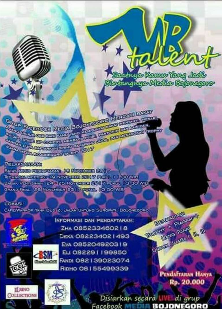 Event tahunan lomba MB Talent 2017 yang digelar Warganet Bojonegoro dari Grup Facebook ternama MB ini, merupakan ajang pencarian dan unjuk gigi dan penyaluran bakat bagi kamu yang mempunyai bakat Menyanyi, Menari, Sulap, Stand Up Comedy, Membaca Puisi, Pantomim, dan lain – lain.